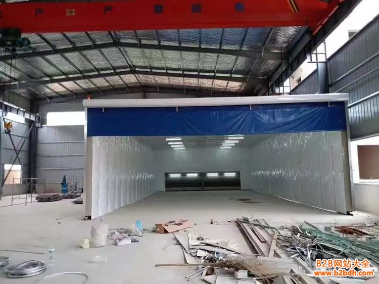 移动伸缩前室由钢架结构和阻燃PVC布组成,通过平行四边形连杆机构或轨道驱动系统实现自动展开与合拢。工作时,前室沿轨道平滑移动至工件上方,形成封闭/半封闭空间进行喷漆;完成后收缩至一侧,节省空间并实现多工序共用场地。其核心系统包括: